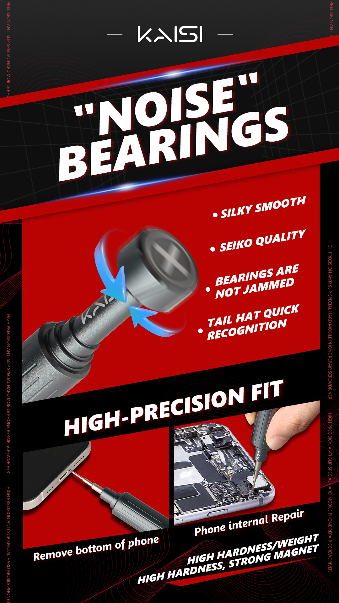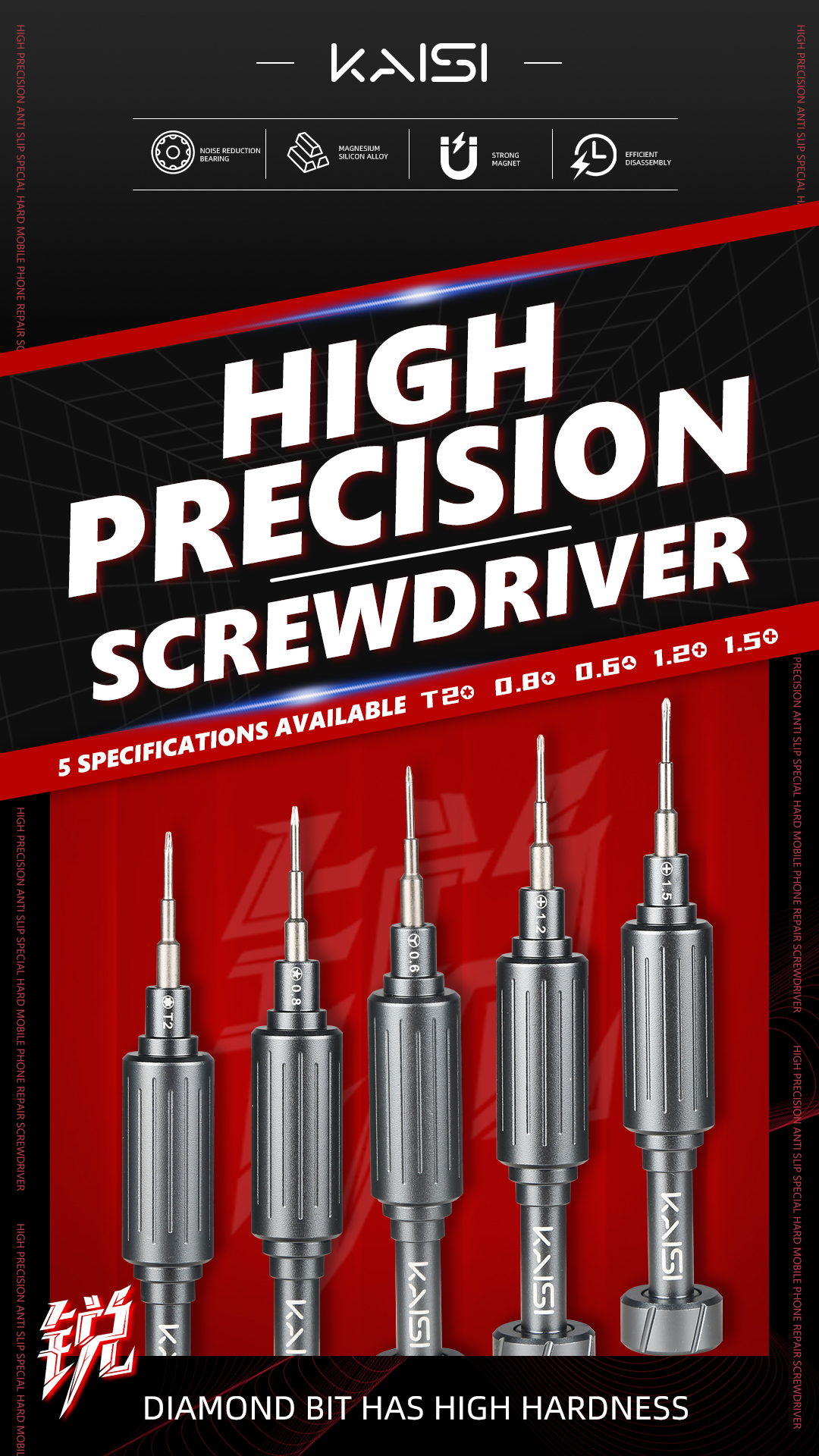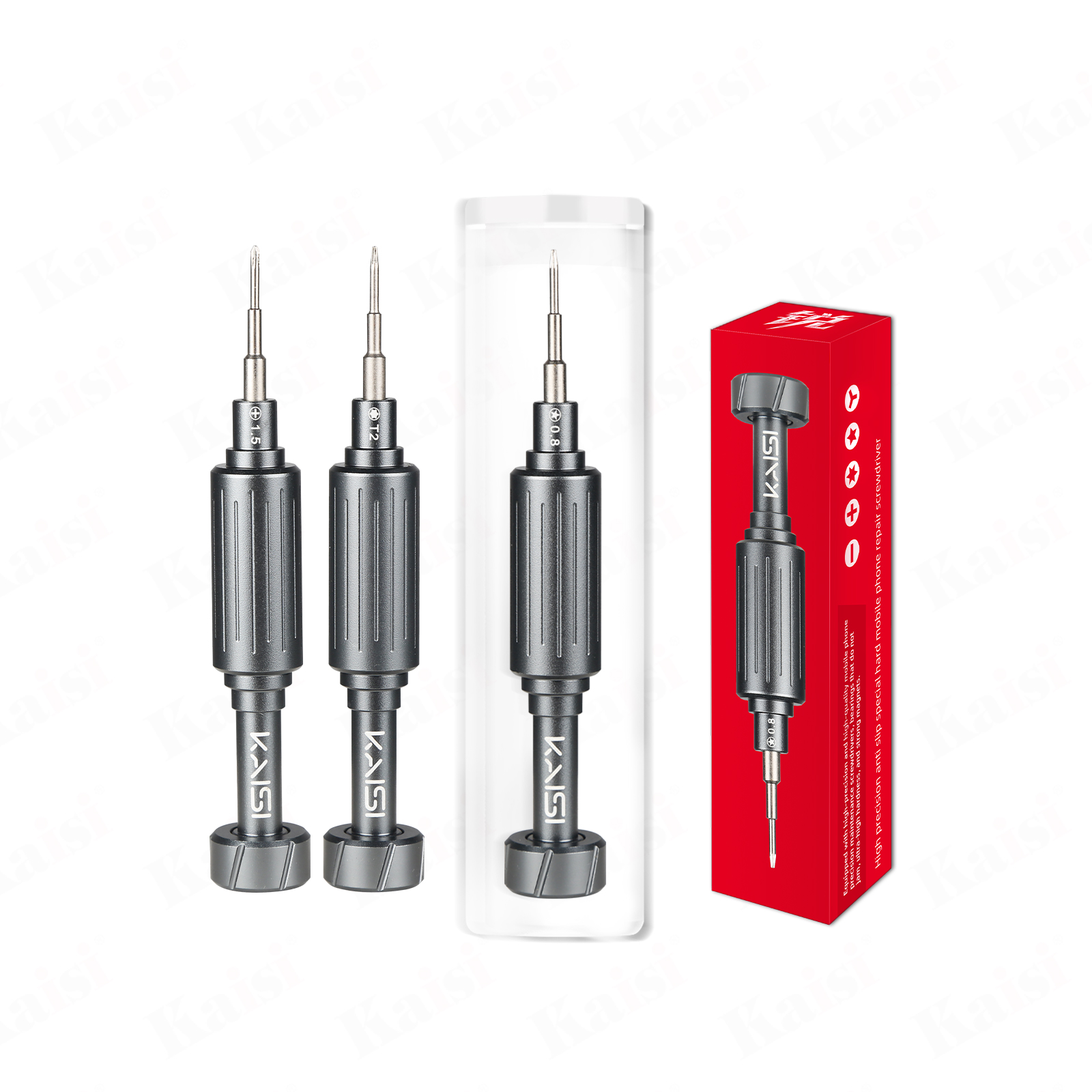 Rui - Precision Screwdriver, an efficient tool specially designed for the maintenance of electronic equipment. Equipped with 5 commonly used specifications (0.8 pentagonal, T2 hexagonal, 1.5 cross, 1.2 cross, 0.6 triangle), it can easily meet the disassembly needs of both Apple and Android phones. It adopts a noise-reducing bearing design, ensuring smooth and effortless rotation, and can rotate continuously for up to one minute. The batch head is made of high-hardness S2 alloy steel, which is anti-slip, wear-resistant and durable. The strong magnetic adsorption tip firmly grasps small screws, avoiding the risk of them falling. The precise interlocking structure enables you to handle the disassembly of the back cover, the motherboard shield, and even the tiny fixing screws with ease, helping you complete every disassembly task efficiently.
