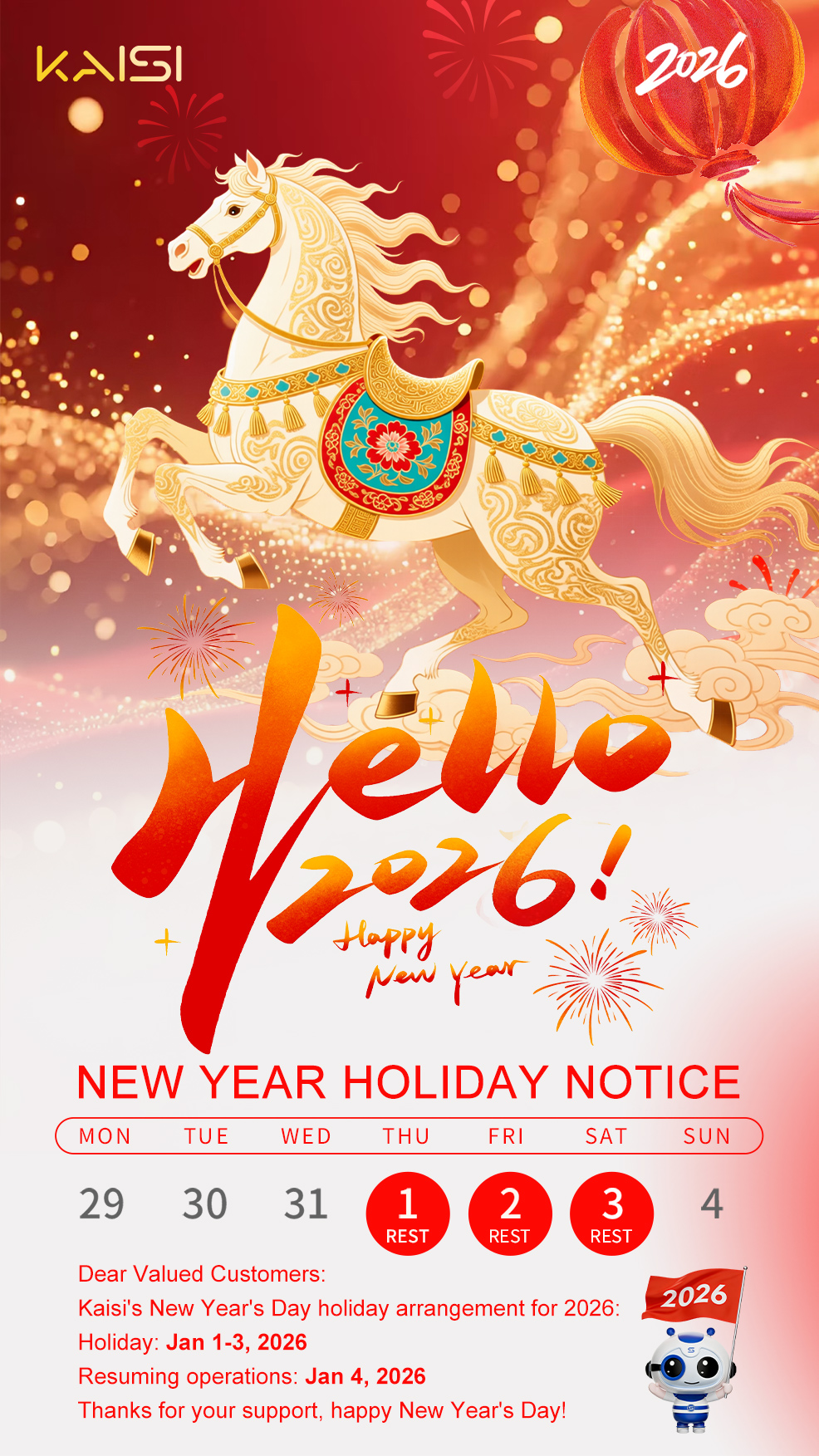 Normal work will resume on Sunday, January 4, 2026.