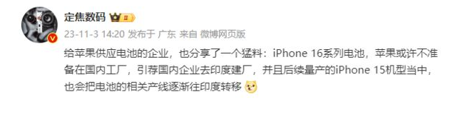 【CNMO新闻】11月3日,CNMO注意到,有数码博主发文称,据给苹果供应电池的企业透露,苹果可能不再将iPhone 16系列的电池生产放在中国,而是引导中国企业前往印度建厂,以实现当地生产。这一决策也将逐渐影响后续iPhone 15机型的电池生产,意味着苹果正计划将电池生产线向印度转移。